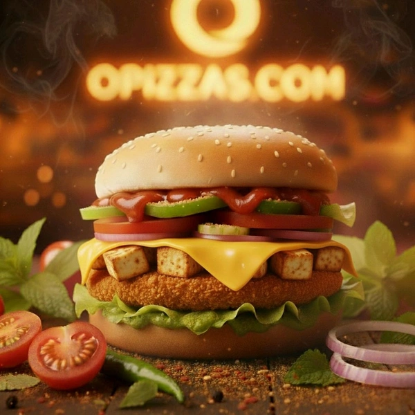 At its heart is a crispy, savory tikki patty (presumably vegetable or potato-based), generously topped with golden-brown, grilled Paneer Cubes and draped with a slice of creamy melted cheese. Layered with crisp lettuce, fresh tomatoes, crunchy cucumbers, and red onions, then drizzled with our special tangy sauce, this burger is a symphony of textures and wholesome, cheesy flavors. It's truly the ultimate vegetarian fusion burger!