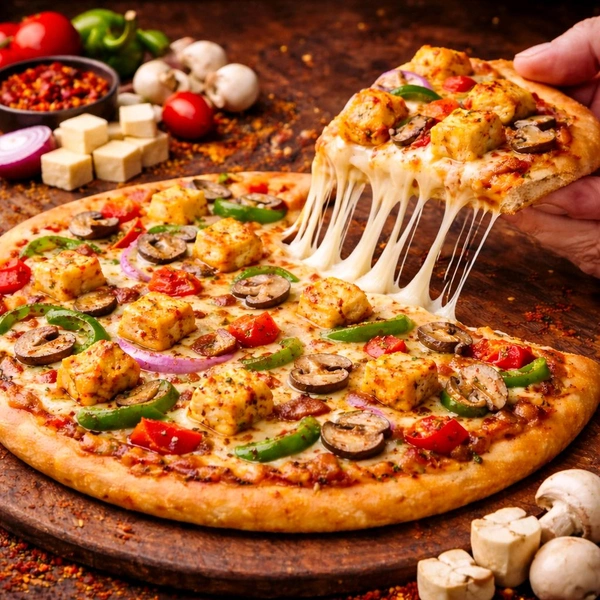 Experience the perfect fusion of flavors with our Spicy Paneer Mushroom Fusion Pizza, loaded with richly seasoned paneer cubes and juicy mushrooms, infused with bold, spicy masala.