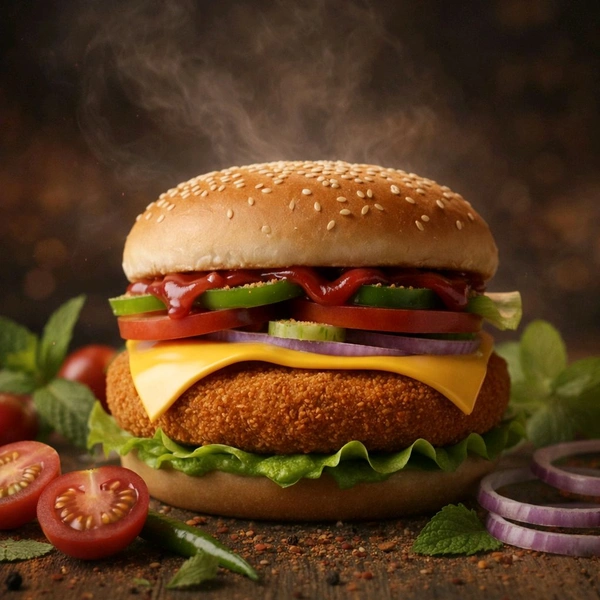 At its heart is a perfectly seasoned, crispy vegetable tikki patty, golden-brown and packed with savory flavor, generously draped with a slice of delicious melted cheese. Layered with fresh, crisp lettuce, juicy tomatoes, crunchy cucumbers, and red onions, then drizzled with a tangy, flavorful sauce, this burger is a symphony of textures and wholesome, cheesy tastes. It's the ultimate go-to vegetarian burger for a truly satisfying and indulgent meal!